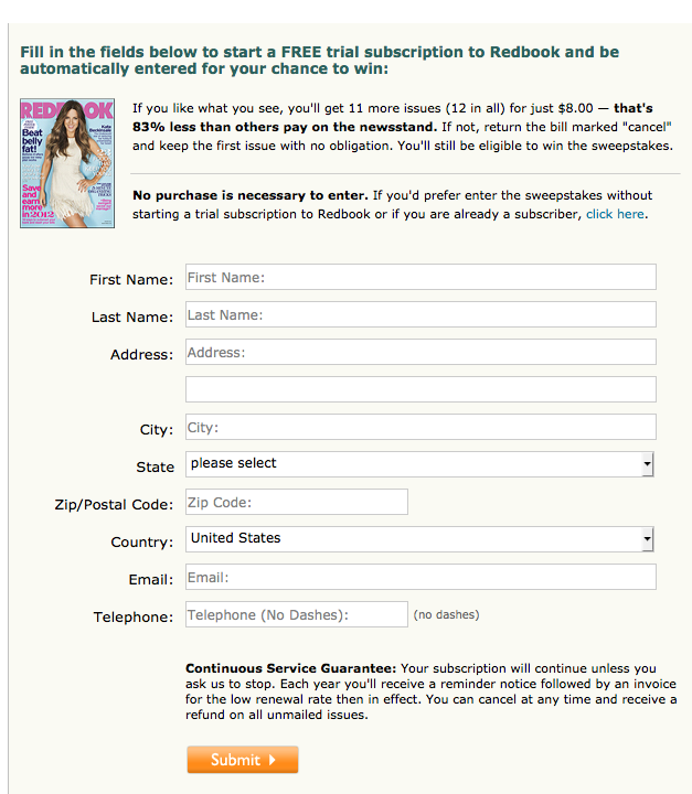 This is the link for the 1st option, which if you don't look for the link to click to the "No Purchase Necessary" option, you will receive a Redbook magazine subscription.